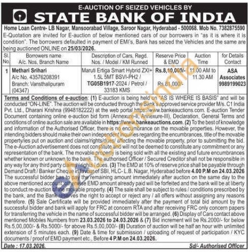 Description of Cars, Regd. Nos./Model/KM Runned : Maruti Ertiga Smart Hybrid ZXI 1.5L 5MT BSVI-PH2/TG05B1917-2024/Petrol/33183 KMS