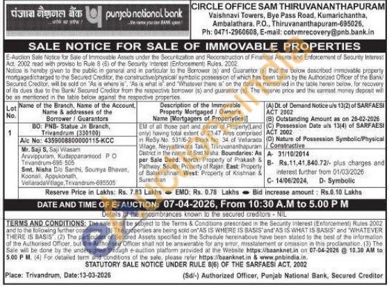 EM of all those part and parcel of Property Land only) having total extent of of 23.47 Ares comprised n ReSy No. 531/6-2, Block No 34 of Vellaraca Whage, Neyyattinkara Takuk, Thiruvananthapuram District in the name of Smt. Nesha. Boundaries: As per Sale Deed. North: Property of Prakash & Pathway South: Property Property of of Rajan East Property of Balakrishnan: West: Property of Knishnan & Surendran