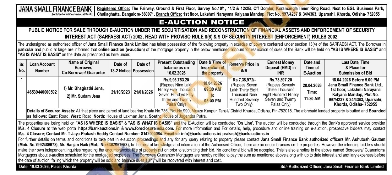 Details of Secured Assets: All that piece and parcel of land bearing Khata No.736, Plot No.990, Mouza Kanpur, Tahsil/ District Khurda, Odisha, Pin-752018. The aforesaid landed property is butted and Bounded as follows: East: Road, West: Road, North: House of Laxman Jena, South: House of Jogendra Patra.