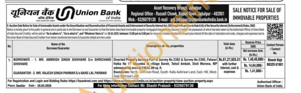 Diverted Property bearing Part of Survey No 2392 & Survey No 2395, Patwari Halka No 17 sitauated at village Bareh, Tehsil Ambah, Distt Morena, MP admeasuring area of 24642.00 sq. ft. Boundaries: North-Common Road, South-Kallu Aahirwar Land, East-Hill, West- Gopi Aahirwar Land