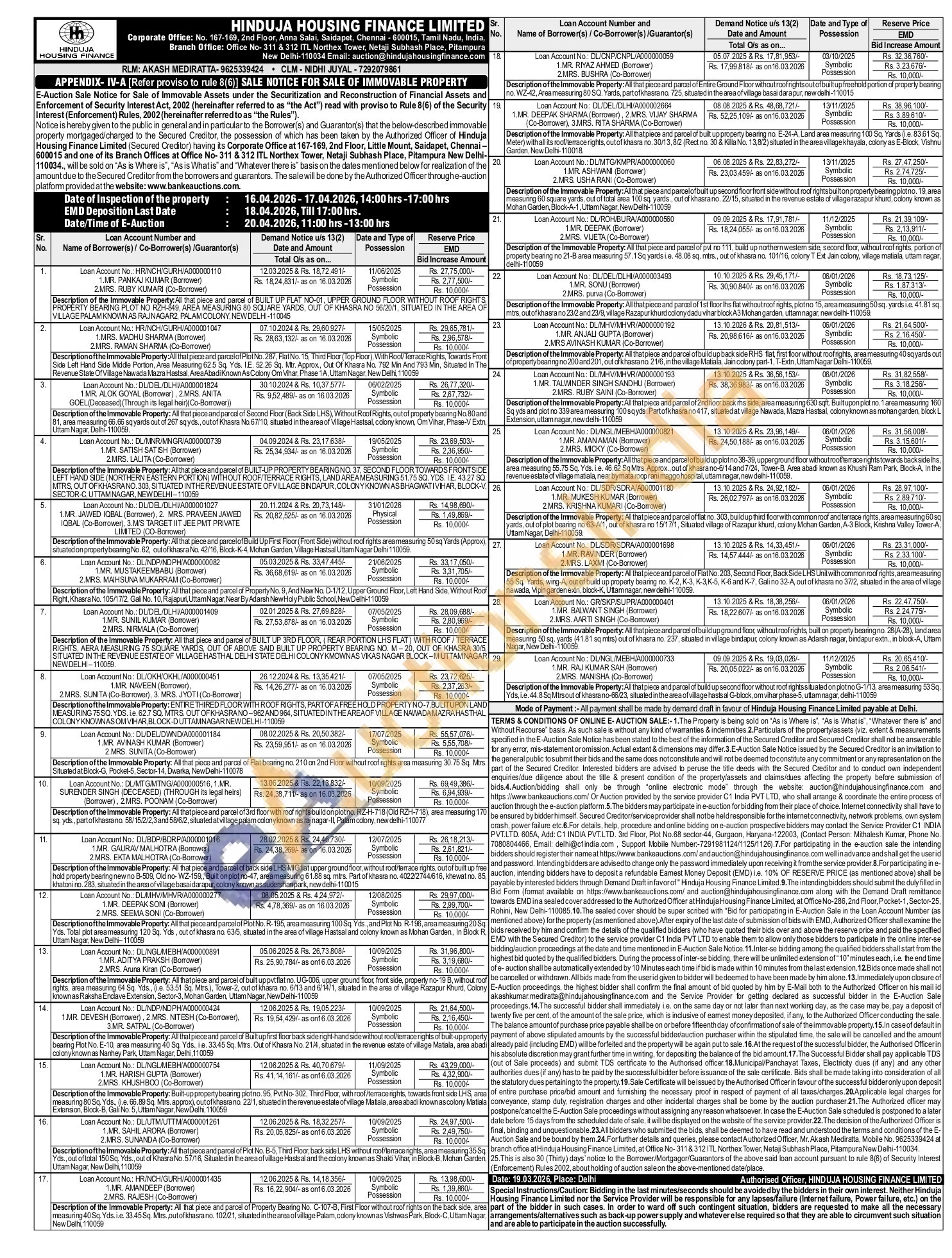 Description ofthe Immovable Property: All thatpiece and parcelofFlatNo. 203,SecondFloor, BackSideLHS Unitwithcommonroofrights, areameasuring 55 Sq. Yards, wing-A, out of build up property bearing no. K-2, K-3, K-3,K-5, K-6 and K-7, Gali no 32-A, out of khasra no 37/2, situated in the area of village nawada, Vipingardenextn, block-K,Uttam nagar, new delhi-110059
