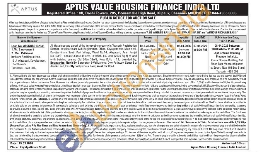 All that piece and parcel of the immovable property in Tuticorin Registration District, Kayalpattinam Sub Registration Office, Kayalpattinam Municipal, Kayalpattinam South Part Village, Ward No.14, Alagapuri, Ayan Punjai No.133/21, consist 3 acre 48 cent, in which 4.67 cent (2035 Sq.ft) of land with building bearing Old D.No 38A/2, New D.No 13J bounded by, Boundaries: North By: Saravanan & Valliyammal Own Pathway, South By. Janaki Land, East By: Valliyammal Land, West By: Road.