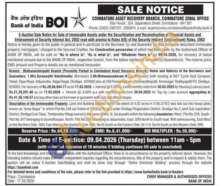 Land and Building situated within the extent of 4.02 acres in S.No.579/2 was laid out into house plots known as "Anna Nagar" in which Plot No.248 (an Extent of 2235Sq.Ft) falls under Dindigul Registration District, Dindigul No.2 Joint Sub registration District, Dindigul East Taluk, Thottanuthu Village owned in the name of Mrs. N. Saraswathi within the following boundaries: West: Plot No. 229, South: Plot No.247 belonging to Govindharajan, North: Plot No.249 belonging to Jebunnisha, East: 20Ft North to South road. With admeasuring, East West on the Northern Side: 60ft, East West on the Southern Side: 60ft, North South on the Eastern Side: 35% ft, North South on the Western Side: 39ft