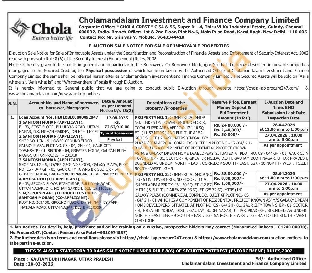 PROPERTY NO. 1: COMMERICAL SHOP NO. LGK-9 ON LOWER GROUND FLOOR, TOTAL SUPER AREA APPROX. 124.10 SQ. FT. (11.53 MTRS.) AND BUILT-UP AREA 68.25 SQ. FT. (6.34 SQ. MTRS.) IN 'GALAXY PLAZA' (COMMERCIAL COMPLEX), BUILT ON PLOT NO.-CS-04/GH-01 WHICH IS A COMPONENT OF RESIDENTIAL PROJECT KNOWN AS 'M/S GALAXY DREAM HOME DEVELOPERS' SITUATED AT PLOT NO. CS-04/GH-01, GAUR CITY TOWN SHIP-01, SECTOR-4, GREATER NOIDA, DISTT. GAUTAM BUDH NAGAR, UTTAR PRADESH, BOUNDED AS UNDER: NORTH-EAST: CORRIDOR SOUTH-EAST: LGK-10 NORTH-WEST: TOILET SOUTH-WEST: LG-5