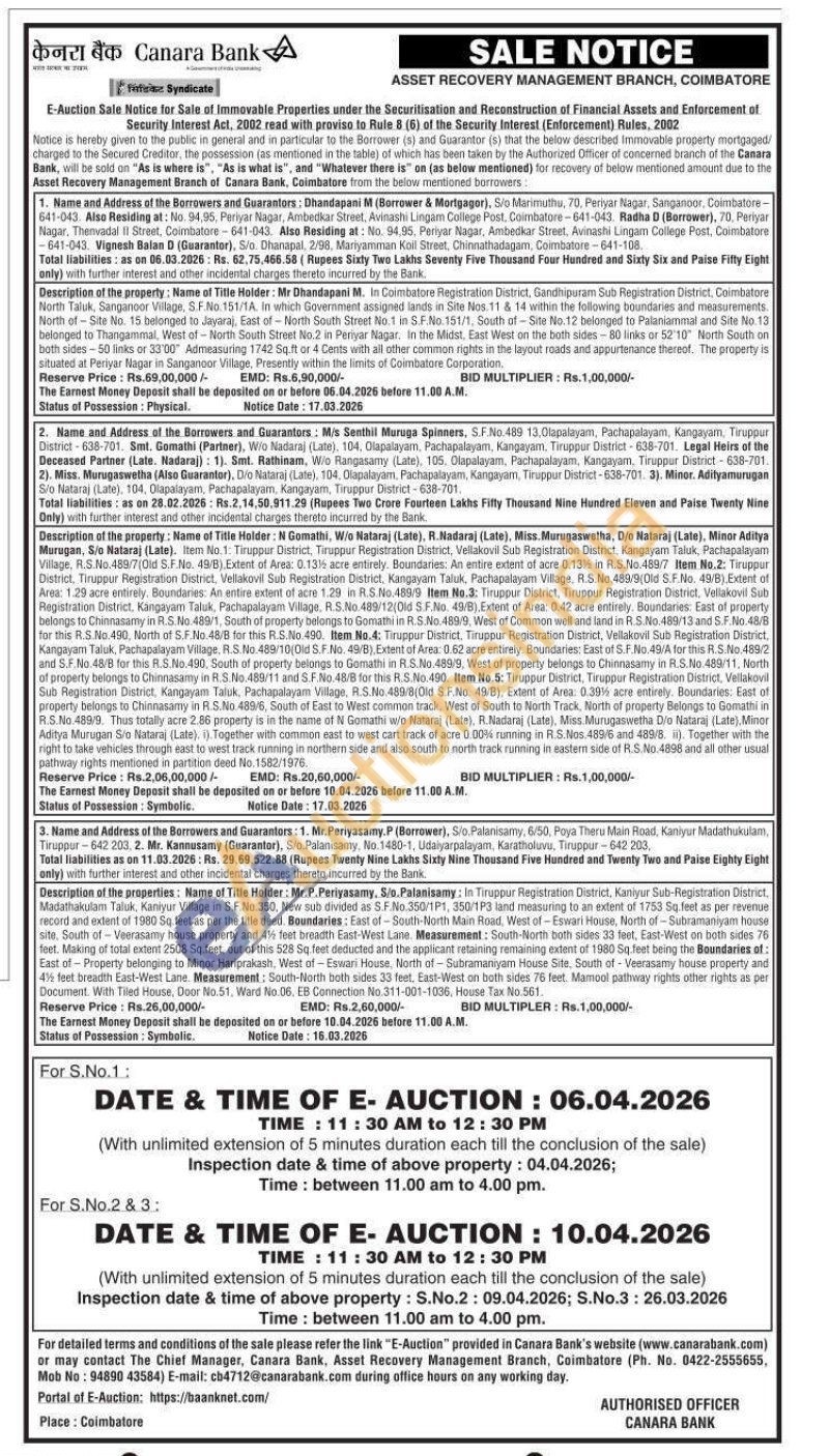 Item No.1: Tiruppur District, Tiruppur Registration District, Vellakovil Sub Registration District, Kangayam Taluk, Pachapalayam Village, R.S.No.489/7(Old S.F.No. 49/B) Extent of Area: 0.13% acre entirely. Boundaries: An entire extent of acre 0.13% in R.S.No.489/7 Item No.2: Tiruppur District. Tiruppur Registration District, Vellakovil Sub Registration District, Kangayam Taluk, Pachapalayam Village, R.S.No.489/9(Old S.F.No. 49/B), Extent of Area: 1.29 acre entirely, Boundaries: An entire extent of acre 1.29 in R.S.No.489/9 Item No.3: Tiruppur District, Tiruppur Registration District, Vellakovil Sub Registration District, Kangayam Taluk, Pachapalayam Village. R.S.No. 489/12(Old S.F.No. 49/B), Extent of Area: 0.42 acre entirely. Boundaries: East of property belongs to Chinnasamy in R.S. No.489/1, South of property belongs to Gomathi in R.S.No.489/9, West of Common well and land in R.S.No.489/13 and S.F.No.48/B for this R.S.No.490, North of S.F.No.48/B for this R.S.No.490. Item No.4: Tiruppur District, Tiruppur Registration District, Vellakovil Sub Registration District, Kangayam Taluk, Pachapalayam Village, R.S. No.489/10(Old S.F.No. 49/B), Extent of Area: 0.62 acre entirely. Boundaries: East of S.F.No.49/A for this R.S.No.489/2 and S.F.No. 48/B for this R.S.No.490, South of property belongs to Gomathi in R.S.No.489/9, West of property belongs to Chinnasamy in R.S.No.489/11, North of property belongs to Chinnasamy in R.S.No.489/11 and S.F.No.48/B for this R.S.No.490. Item No.5: Tiruppur District, Tiruppur Registration District, Vellakovil Sub Registration District, Kangayam Taluk, Pachapalayam Village, R.S.No. 489/8(Old S.F.No. 49/B), Extent of Area: 0.39% acre entirely. Boundaries: East of property belongs to Chinnasamy in R.S.No. 489/6, South of East to West common track, West of South to North Track, North of property Belongs to Gomathi in R.S.No.489/9, Thus totally acre 2.86 property is in the name of N Gomathi w/o Nataraj (Late), R. Nadaraj (Late), Miss. Murugaswetha D/o Nataraj (Late), Minor Aditya Murugan Si/o Nataraj (Late), 1). Together with common east to west cart track of acre 0.00% running in R.S. Nos. 489/6 and 489/8. ii). Together with the right to take vehicles through east to west track running in northern side and also south to north track running in eastem side of R.S.No.4898 and all other usual pathway rights mentioned in partition deed No. 1582/1976, Reserve Price: Rs.2,06,00,000/-