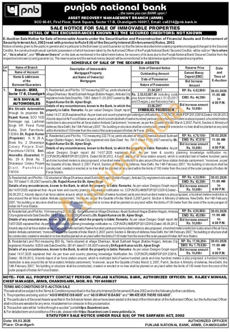 Residential Land Plot No. 102 situated at Village Dhankaur, abadi Subhash Nagar (BaldevNagar), Ambala City registeredvide sale deed No. 707 dated 11.05.2007 owned by Sh. Rajesh Kumar S/o Sh. Ajmer Singh Bid increase amount Details of any encumbrances, known to the Bank, to which the property is liable: Remarks: As per valuer Designo Graph report dtd 14/07/2025 explained that-As per town and country planning knowledge notification no. CCP(NCR)/AMB/FDP/2012/2916 Abomb depot of air force station around, which is restricted belt of twelve hundred yards and nine hundred meters is also proposed, a hundred meters restriction is also around the air force station Ambala cantonment, 'moreover, as per the Gazette of India: March 3,2007, part-11, Section 4, Ministry of defense, New Delhi, the 14th February 2007, "No building or structure shall be constructed, created or erected or no tree shall be planted on any land within the limits of 100 meter from the crest of the outer parapet of Indian Air Force Station.