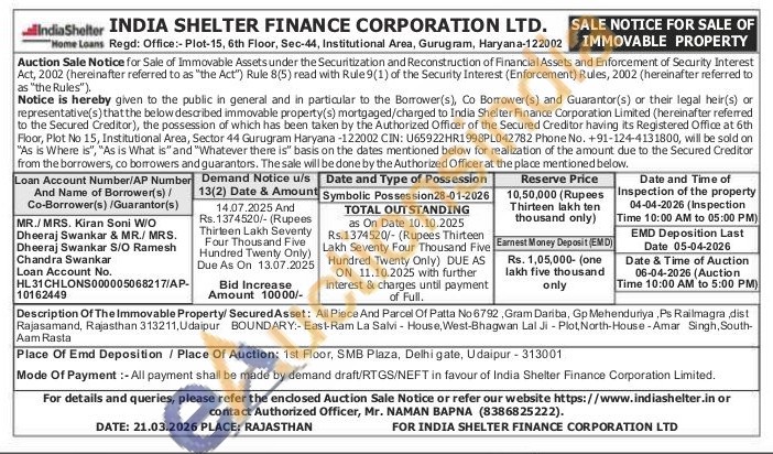 Description Of The Immovable Property/Secured Asset: All Piece And Parcel Of Patta No 6792, Gram Dariba, Gp Mehenduriya, Ps Railmagra dist Rajasamand, Rajasthan 313211, Udaipur BOUNDARY:- East-Ram La Salvi - House, West-Bhagwan Lal Ji - Plot, North-House-Amar Singh, South-Aam Rasta