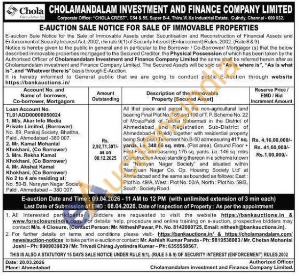All that piece and parcel in the non-agricultural land bearing Final Plot No. 189 and 190 of T. P. Scheme No. 22 of Mouje Paldi of Taluka Sabarmati in the District of Ahmedabad and Registration Sub-District of Ahmedabad-4 (Paldi) together with residential property being Sub plot/Tenement No. B-50 admeasuring 417 sq. yards. i.e. 348.66 sq. mtrs. (Plot area), Ground Floor + First Floor admeasuring 175 sq. yards, i.e. 146 sq. mirs (Construction Area) standing thereon in a scheme known as "Narayan Nagar Society and situated within "Narayuan Nagar Co. Op. Housing Society Ltd at Ahmedabad and the same as bounded as follows, East: Plot No. 49/A, West: Plot No. 50/A, North: Plot No. 59/B, South: Society Road.