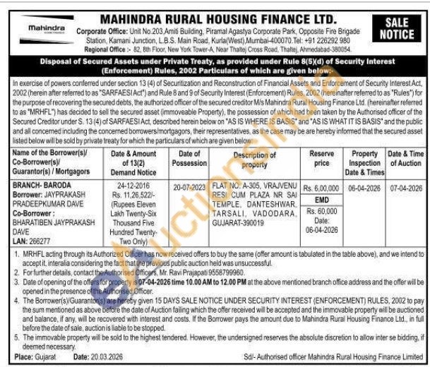FLAT NO. A-305, VRAJVENU RESI CUM PLAZA NR SAI TEMPLE, DANTESHWAR, GUJARAT-390019 TARSALI, VADODARA,