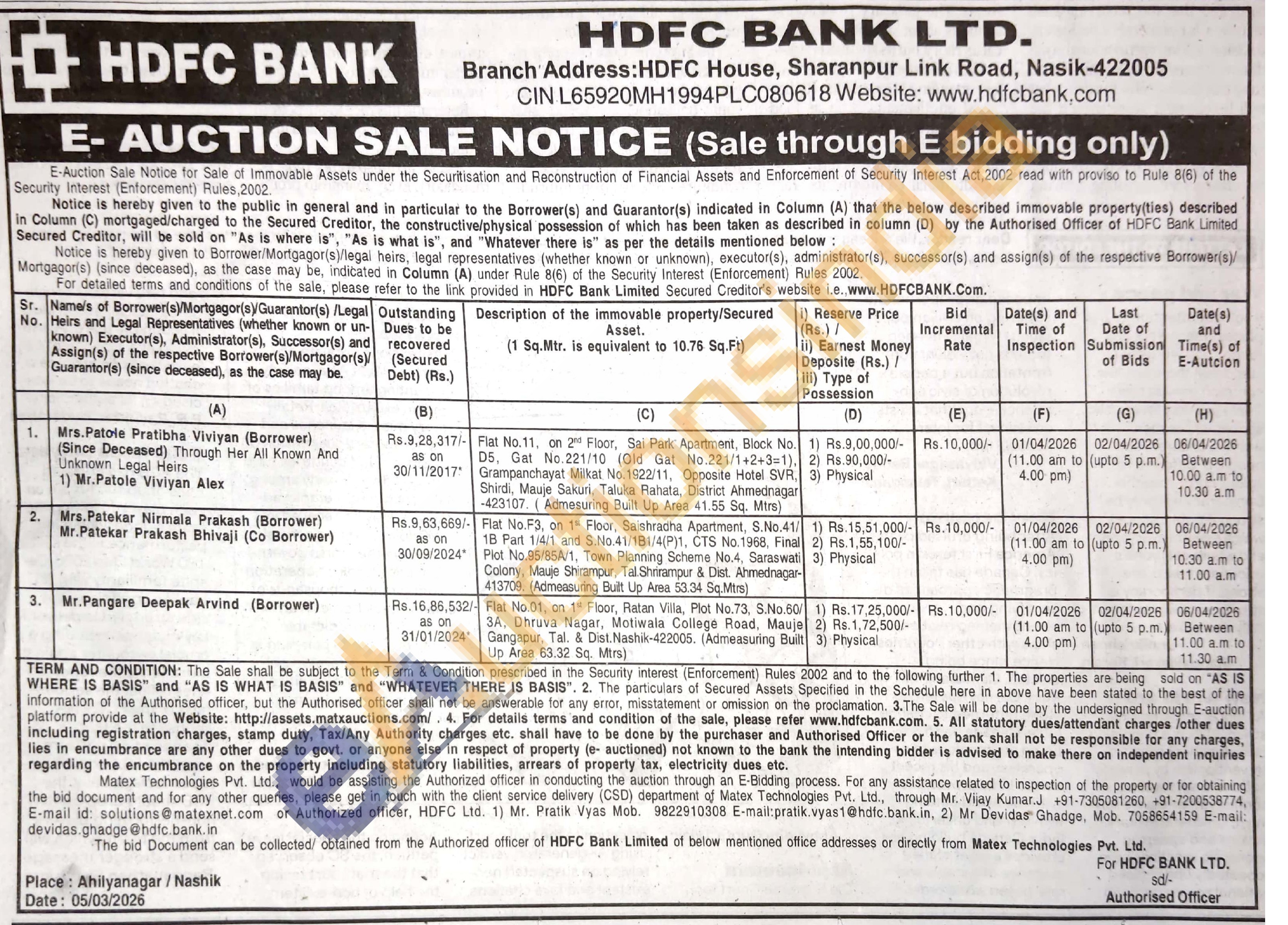 Flat No.F3, on 1 Floor, Saishradha Apartment, S.No.41/1B Part 1/4/1 and S.No.41/1B1/4(P)1, CTS No.1968, Final Plot No.95/85A/1, Town Planning Scheme No.4, Saraswati Colony, Mauje Shirampur, Tal.Shrirampur & Dist. Ahmednagar-413709. (Admeasuring Built Up Area 53.34 Sq.Mtrs)