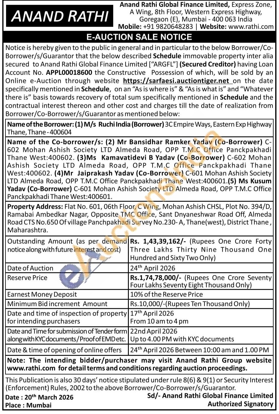 Property Address: Flat No. 601, 06th Floor, C Wing, Mohan Ashish CHSL, Plot No. 394/D, Ramabai Ambedkar Nagar, Opposite TMC Office, Sant Dnyaneshwar Road Off, Almeda Road CTS No.650 Of village Panchpakhadi Survey No.230-A, Thane (west), District Thane, Maharashtra