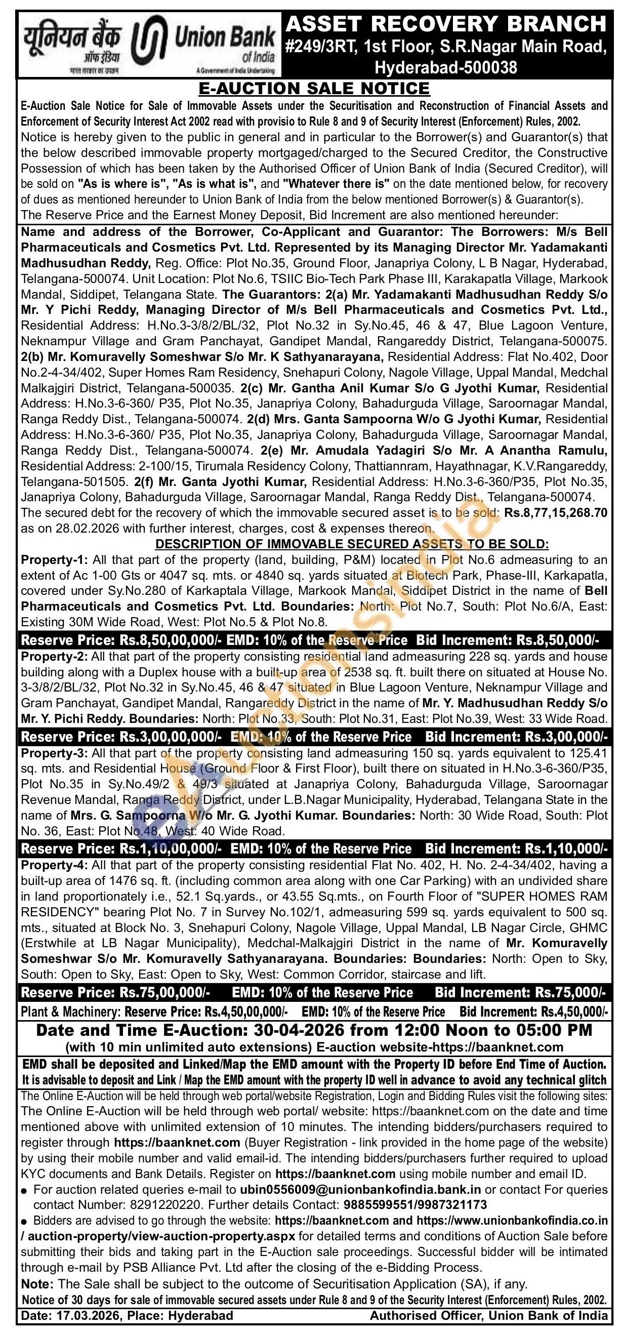 Property-1: All that part of the property (land, building, P&M) located in Plot No.6 admeasuring to an extent of Ac 1-00 Gts or 4047 sq. mts. or 4840 sq. yards situated at Biotech Park, Phase-III, Karkapatla, covered under Sy.No.280 of Karkaptala Village, Markook Mandal, Siddipet District in the name of Bell Pharmaceuticals and Cosmetics Pvt. Ltd. Boundaries: North: Plot No.7, South: Plot No.6/A, East: Existing 30M Wide Road, West: Plot No.5 & Plot No.8
