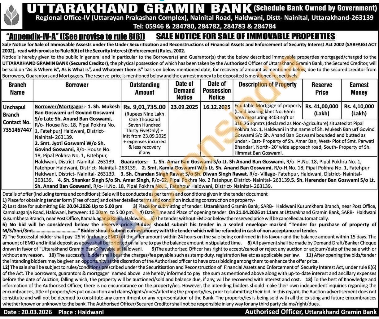 Equitable Mortgage of property : (Land bearing khet No. 65mi area measuring 3403 sqft or 316.26 sqmtrs (declared as Non-Agriculture) situated at Pipal Pokhra No. 1, Haldwani in the name of Sh. Mukesh Ban urf Govind Goswami S/o Sh. Anand Ban Goswami bounded and butted as under:- East-Property of Sh. Amar Ban, West- Plot of Smt. Parwati Bhandari, North-20' wide approach road, South- Property of Sh. Himmat Ban Goswami.