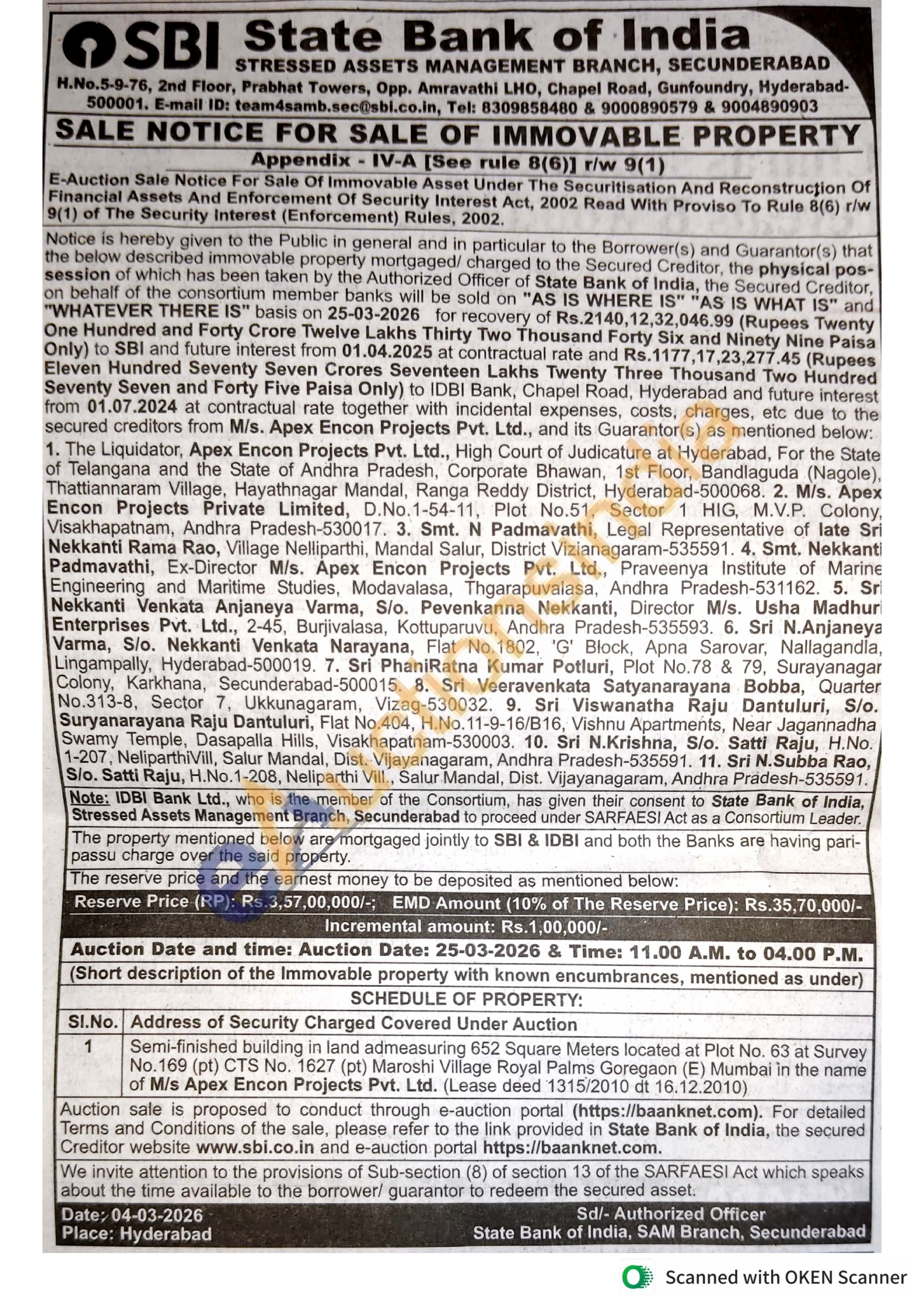 Semi-finished building in land admeasuring 652 Square Meters located at Plot No. 63 at Survey No.169 (pt) CTS No. 1627 (pt) Maroshi Village Royal Palms Goregaon (E) Mumbai in the name of M/s Apex Encon Projects Pvt. Ltd. (Lease deed 1315/2010 dt 16.12.2010)