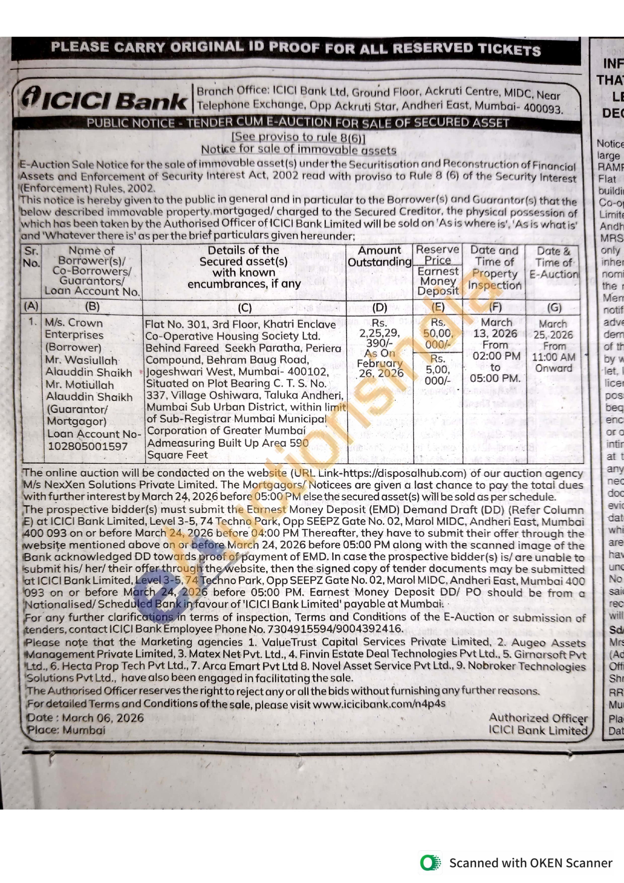 Flat No. 301, 3rd Floor, Khatri Enclave Co-Operative Housing Society Ltd. Behind Fareed Seekh Paratha, Periera Compound, Behram Baug Road, Jogeshwari West, Mumbai- 400102, Situated on Plot Bearing C. T. S. No. 337, Village Oshiwara, Taluka Andheri, Mumbai Sub Urban District, within limit of Sub-Registrar Mumbai Municipal Admeasuring Built Up Area 590 Square Feet Corporation of Greater Mumbai