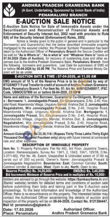 Item No. 1: Property Particulars: Fiat No 402, 3rd Floor, Jayamitra Towers, Location: Ramavarappadu, Survey No: 134/1, 2, 134/2, 134/1, 125/18, D.No. 3-37/1-402, Plot No. 48, Extent: Unspecified & Undivided extent of 37.60 sq yards out of 300 sq yards, Owner's Name: Jonnalagadda Prasad & Jonnalagadda Nagalakshmi. Boundaries: East: Common Corridor, South: Common corridor & staircase, West: Open to sky, North: Open to sky.