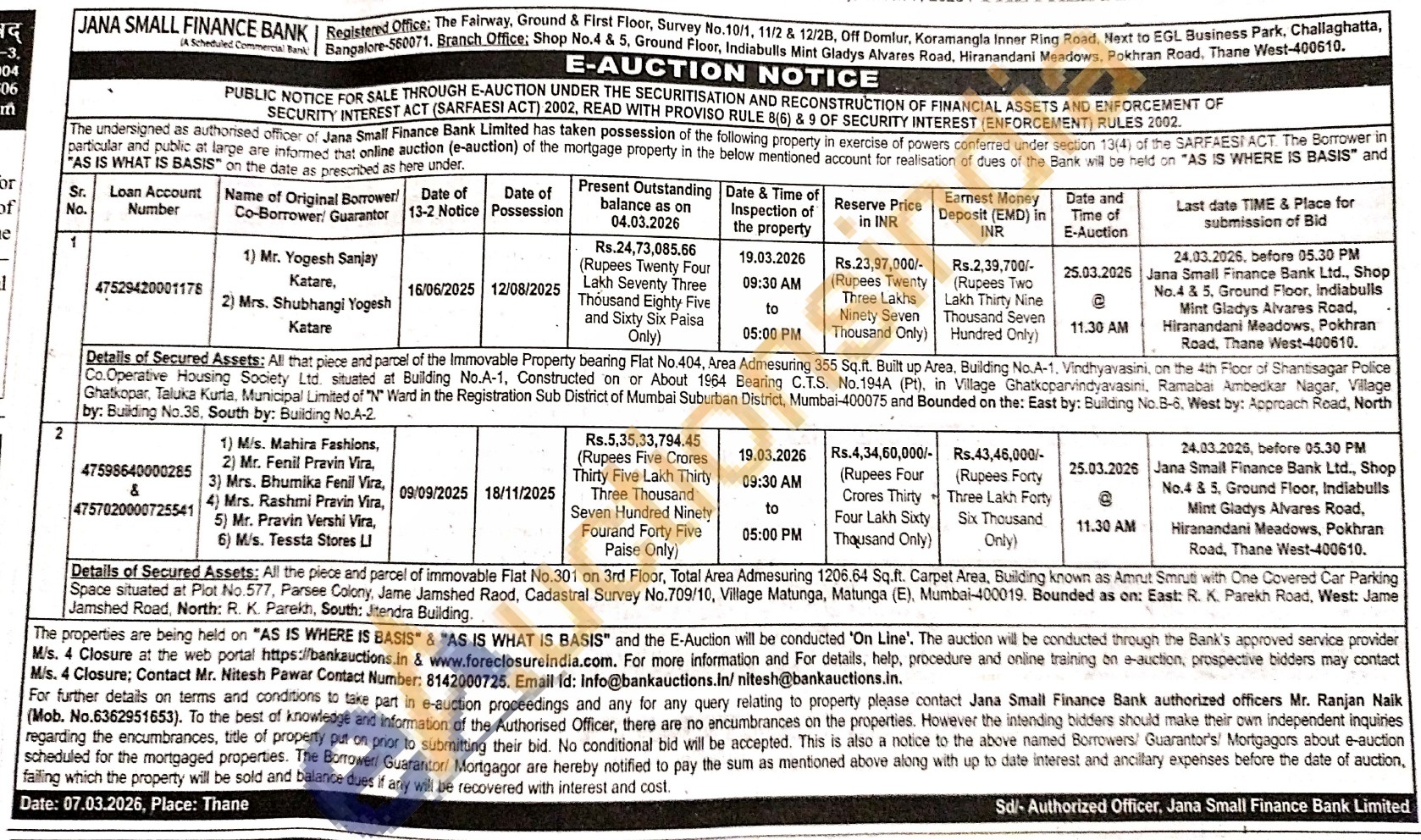 Details of Secured Assets: All the piece and parcel of immovable Fiat No.301 on 3rd Floor, Total Area Admesuring 1206.64 Sq.ft. Carpet Area, Building known as Amrut Smruti with One Covered Car Parking Space situated at Plot No.577, Parsee Colony, Jame Jamshed Raod, Cadastral Survey No.709/10, Village Matunga, Matunga (E), Mumbai-400019. Bounded as on: East: R. K. Parekh Road, West: Jame Jamshed Road, North: R. K. Parekh, South: Jitendra Building.