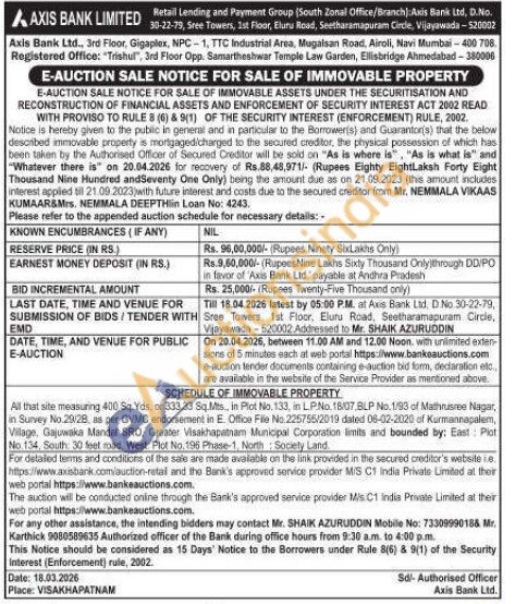 All that site measuring 400 Sq. Yds, or 333.33 Sq.Mts, in Plot No. 133, in L.PNo.18/07 BLP No. 1/93 of Mathrusree Nagar, in Survey No 29/28, as per GVMC endorsement in E. Office File No. 225755/2019 dated 06-02-2020 of Kurmannapałem, Village, Gajuwaka Mandal SRO, Greater Visakhapatnam Municipal Corporation limits and bounded by: East Plot No 134, South: 30 feet road. West: Plot No. 196 Phase-1, North Society Land.