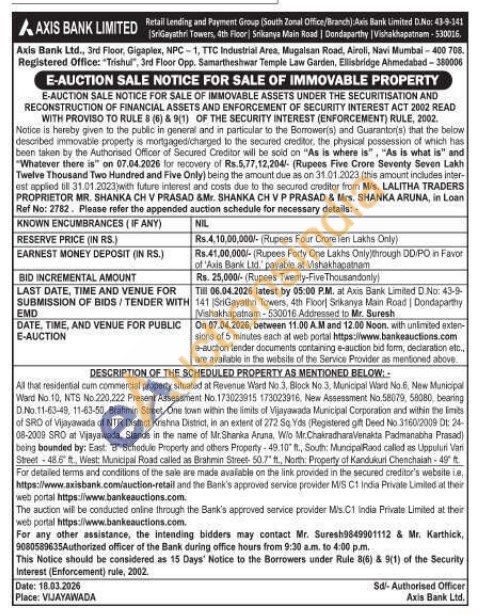 All that residential cum commercial property situated at Revenue Ward No 3, Block No 3, Municipal Ward No. 16. New Municipal Ward No.10, NTS No.220,222 Present Assessment No. 173023915 173023916, New Assessment No.58079, 58080, bearing D.No.11-63-49, 11-63-50, Brahmin Street, One town within the limits of Vijayawada Municipal Corporation and within the Imis of SRO of Vijayawada of NTR District Krishna District, in an extent of 272 So Yds (Registered gift Deed No.3160/2009 Dt: 24-08-2009 SRC at Vijayawada, Stands in the name of Mr.Shanika Anuna, W/o Mr.Chakradharalvienakita Padmanabha Prasad) being bounded by: East B Schedule Property and others Property-49.10 ft., South: Muncipal Raod called as Uppuluri Vari Street-48.6ft, West: Municipal Road called as Brahmin Street- 50.7" ft, North Property of Kandukuri Chenchaiah-49