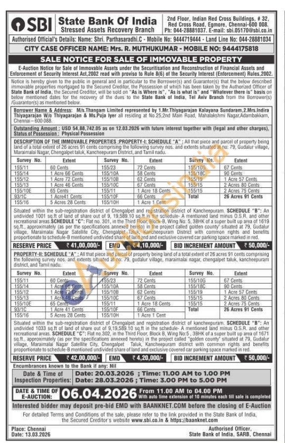 PROPERTY-II: SCHEDULE "A": All that piece and parcel of property being land of a total extent of 26 acres 91 cents comprising the following survey nos, and extents situated at no: 79. gudalur village, maraimalai nagar, chengalpet taluk, kancheepuram district, and Tamil nadu. Situated within the sub-registration district of Chengalpet and registration district of kancheepuram. SCHEDULE "B": An undivided 1033 sq.ft of land of share out of 9,19,589.10 sq.ft in the schedule- A mentioned land minus O.S.R. and other recreational areas. SCHEDULE "C": Flat no.302, in the Third Floor, Block B, Wing No:5, 3BHK of a super built up area of 1671 sq.ft., approximately (as per the specifications annexed hereto) in the project called "golden county situated at 79, Gudalur village, Maraimalai Nagar Satellite City, Chengalpet Taluk, Kancheepuram district with common rights and benefits proportionate to schedule-B mentioned undivided share of land and exclusive covered car parking space marked in red