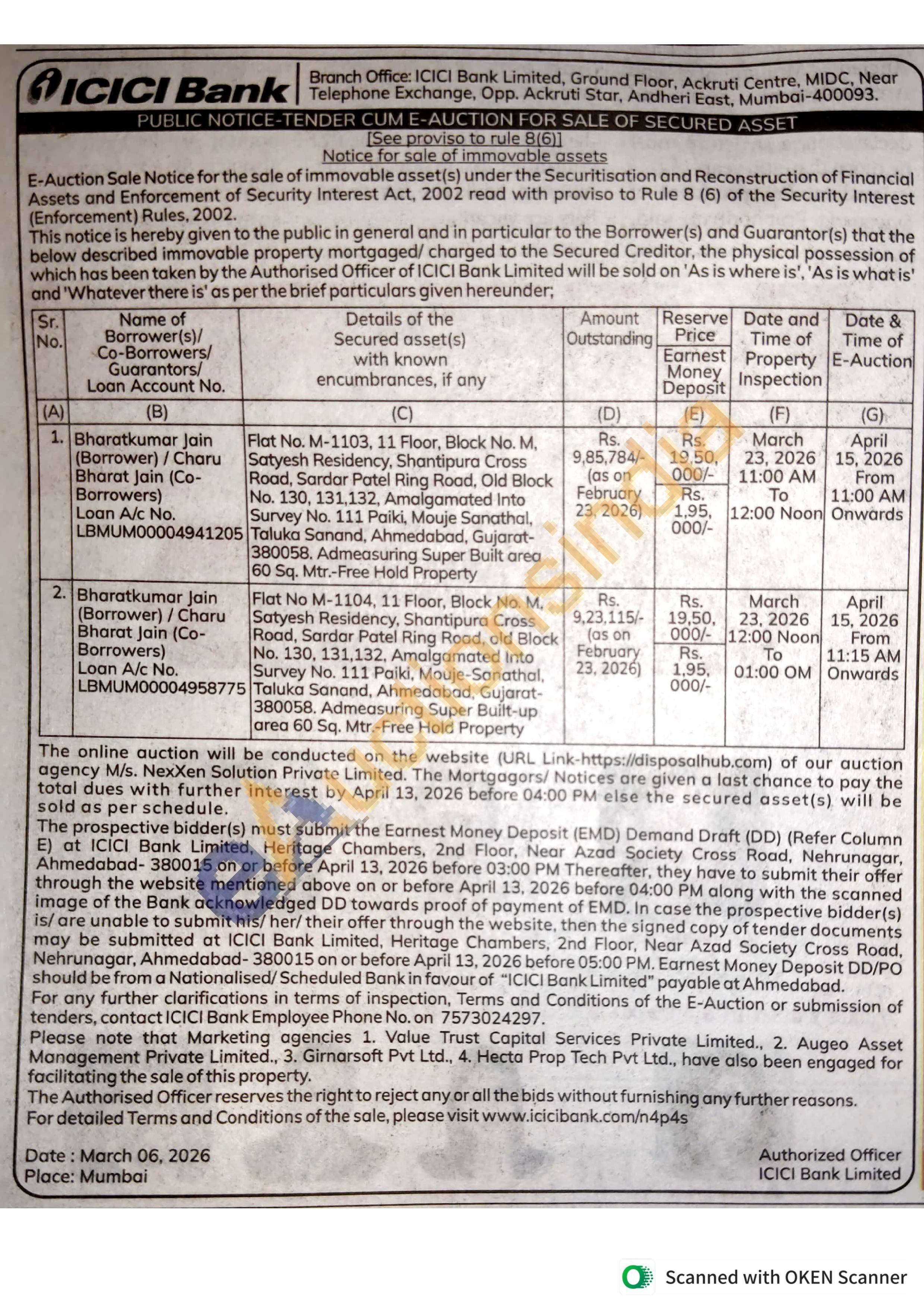 Flat No. M-1103, 11 Floor, Block No. M. Satyesh Residency, Shantipura Cross Road, Sardar Patel Ring Road, Old Block No. 130, 131,132, Amalgamated Into Survey No. 111 Paiki, Mouje Sanathal, Taluka Sanand, Ahmedabad, Gujarat-380058. Admeasuring Super Built area 60 Sq. Mtr.-Free Hold Property