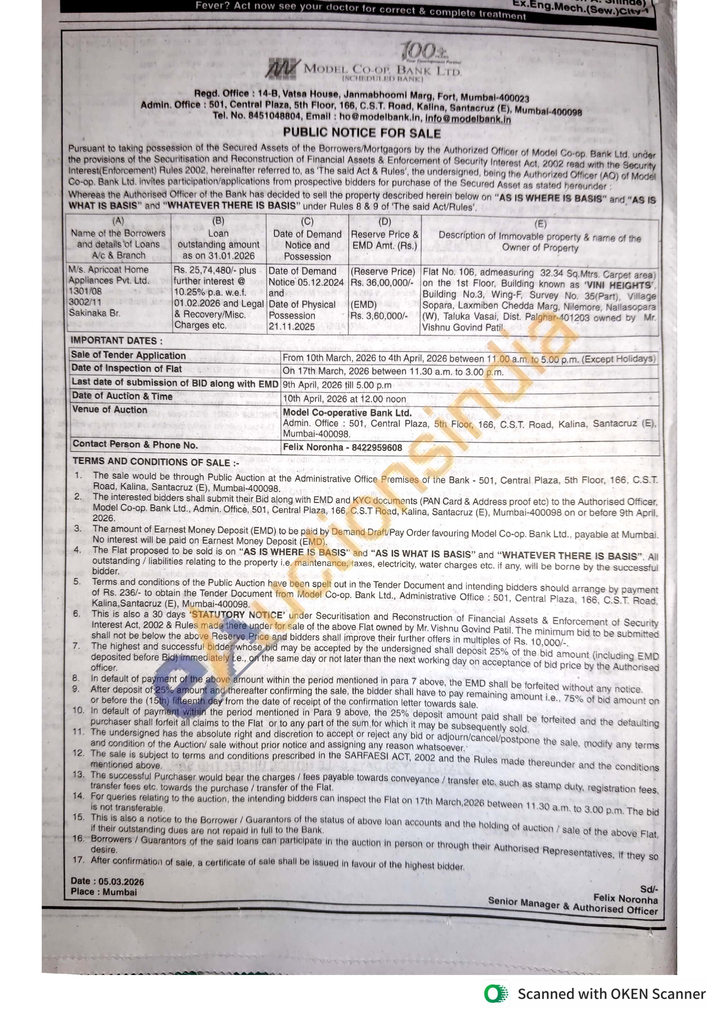 Flat No. 106, admeasuring 32.34 Sq.Mtrs. Carpet area) on the 1st Floor. Building known as 'VINI HEIGHTS Building No.3, Wing-F. Survey No. 35(Part), Village Sopara, Laxmiben Chedda Marg, Nilemore, Nallasopars (W), Taluka Vasal, Dist. Palghar-401203 owned by Mr. Vishnu Govind Patil