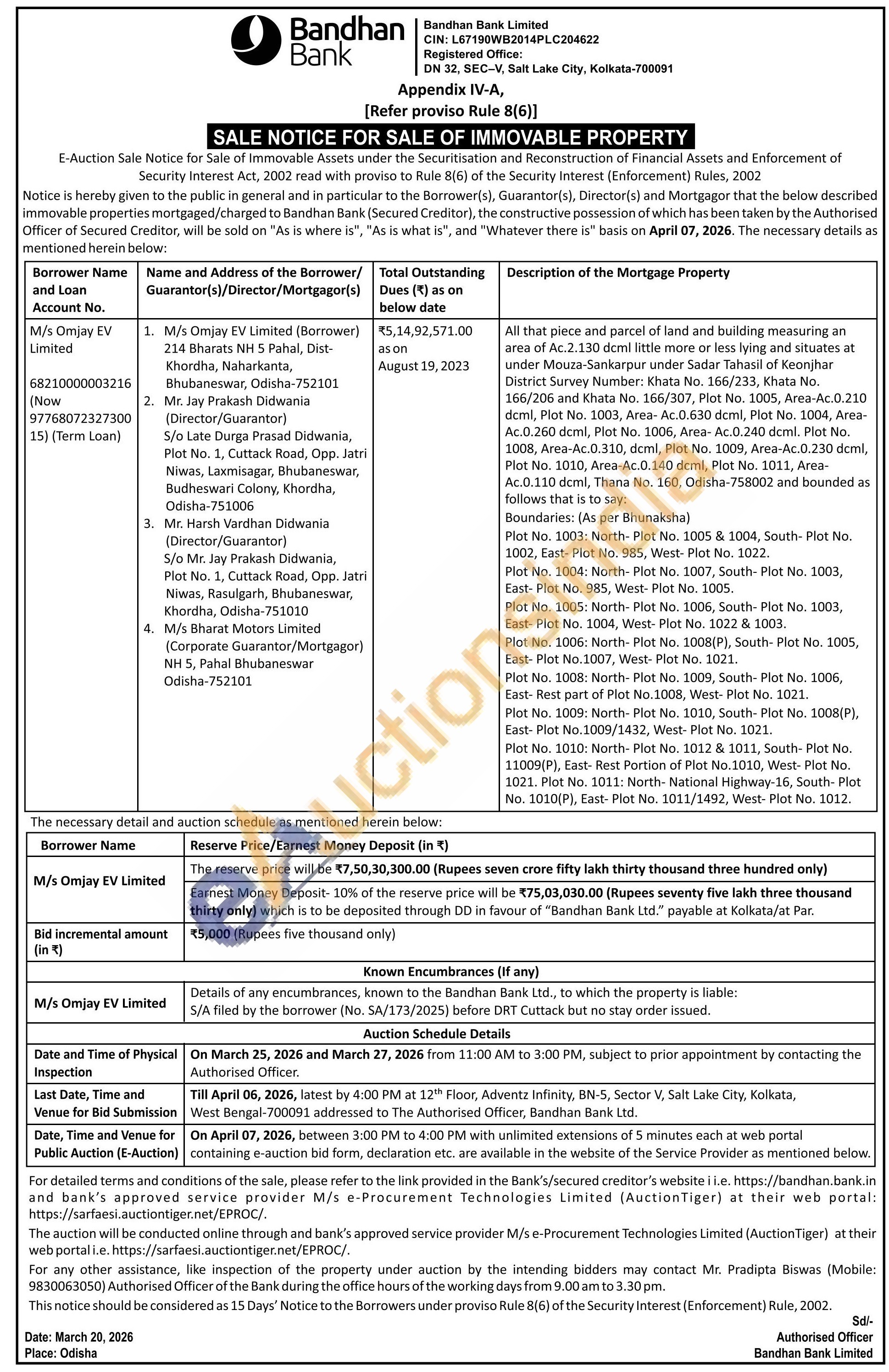 All that piece and parcel of land and building measuring an area of Ac.2.130 dcml little more or less lying and situates at under Mouza-Sankarpur under Sadar Tahasil of Keonjhar District Survey Number: Khata No. 166/233, Khata No. 166/206 and Khata No. 166/307, Plot No. 1005, Area-Ac.0.210 dcml, Plot No. 1003, Area- Ac.0.630 dcml, Plot No. 1004, Area-Ac.0.260 dcml, Plot No. 1006, Area- Ac.0.240 dcml. Plot No. 1008, Area-Ac.0.310, dcml, Plot No. 1009, Area-Ac.0.230 dcml, Plot No. 1010, Area-Ac.0.140 dcml, Plot No. 1011, Area-Ac.0.110 dcml, Tharia No. 160, Odisha-758002 and bounded as follows that is to say: