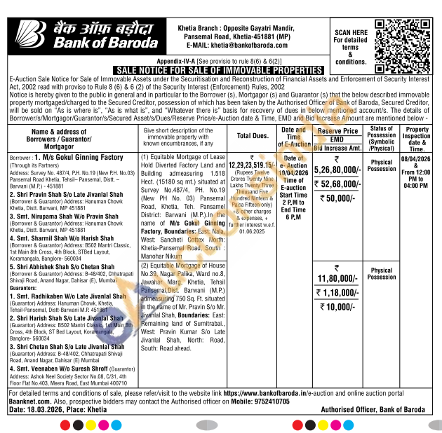 (1) Equitable Mortgage of Lease Hold Diverted Factory Land and Building admeasuring 1.518 Hect. (15180 sq mt.) situated at Survey No.487/4, PH. No.19 (New PH No. 03) Pansemal Road, Khetia, Teh. Pansamel District: Barwani (M.P.). In the name of M/s Gokul Ginning Factory, Boundaries: East: Nala, West: Sancheti Cottex North: Khetia-Pansemal Road, South: Manohar Nikum