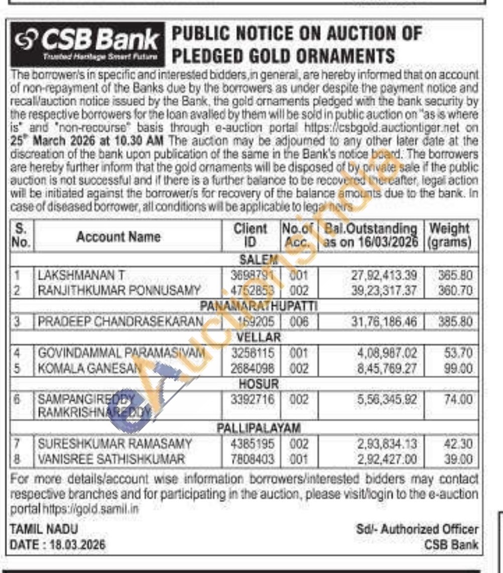 CSB Bank Gold Auctions Auction in Salem