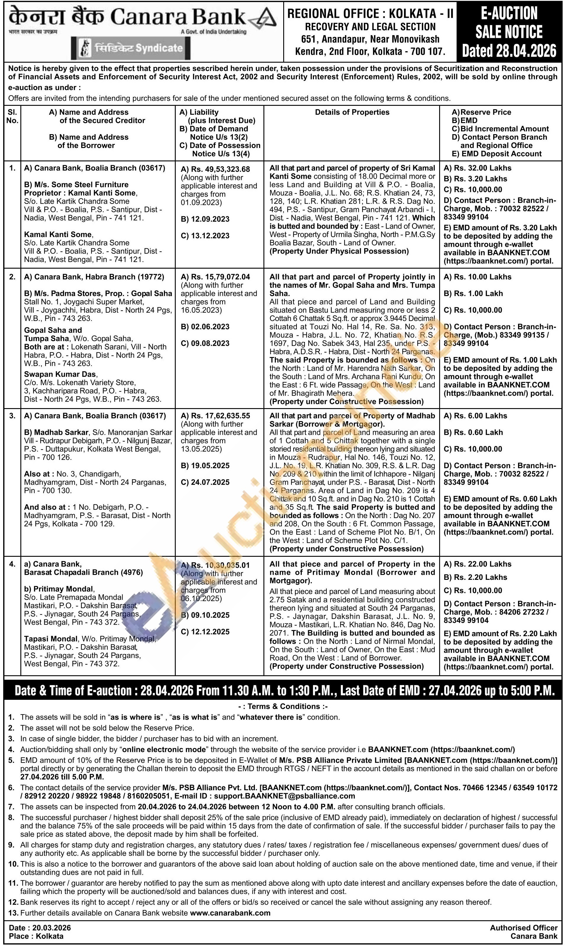 All that part and parcel of Property of Madhab Sarkar (Borrower & Mortgagor) : All that part and parcel of Land measuring an area of 1 Cottah and 5 Chittak together with a single storied residential building thereon lying and situated in Mouza - Rudrapur, Hal No. 146, Touzi No. 12, J.L. No. 19, L.R. Khatian No. 309, R.S. & L.R. Dag No. 209 & 210 within the limit of Ichhapore - Nilganj Gram Panchayat, under P.S. - Barasat, Dist - North 24 Parganas. Area of Land in Dag No. 209 is 4 Chittak and 10 Sq.ft. and in Dag No. 210 is 1 Cottah and 35 Sq.ft. The said Property is butted and bounded as follows: On the North: Dag No. 207 and 208, On the South: 6 Ft. Common Passage, On the East: Land of Scheme Plot No. B/1, On the West: Land of Scheme Plot No. C/1