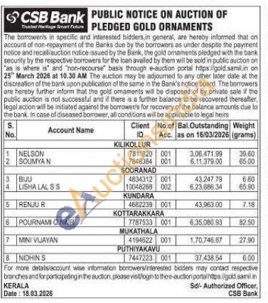 CSB Bank Gold Auctions Auction in Kottarakkara