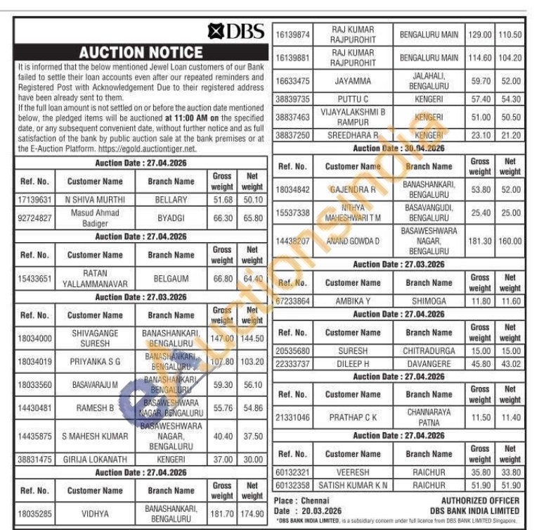 DBS Bank India Limited Gold Auctions Auction in Bengaluru