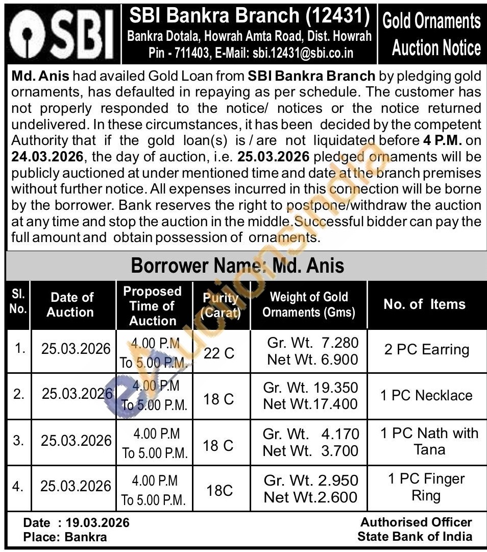 State Bank of India Gold Auctions Auction in Howrah