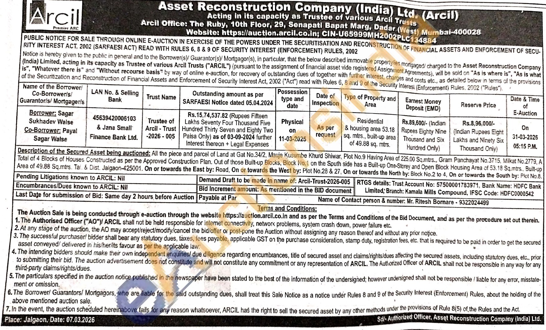 Description of the Secured Asset being auctioned: All the piece and parcel of Land at Gat No.34/2, Mauje Kusumbe Khurd Shiwar, Plot No.9 Having Area of 225.00 Sq.mtrs., Gram Panchayat No.3715, Milkat No.2779, A Total of 4 Blocks of Houses Constructed as per the Approved Construction Plan. Out of those Built-up Blocks, Block No.1 on the South side has a Built-up One-Storey and Open Block Housing Area of 53.18 Sq.mtrs., Built-up Area of 49.88 Sq.mtrs. Tal. & Dist. Jalgaon-425001. On or towards the East by: Road, On or towards the West by: Plot No.28 & 27, On or towards the North by: Block No.2 to 4. On or towards the South by: Plot No.8