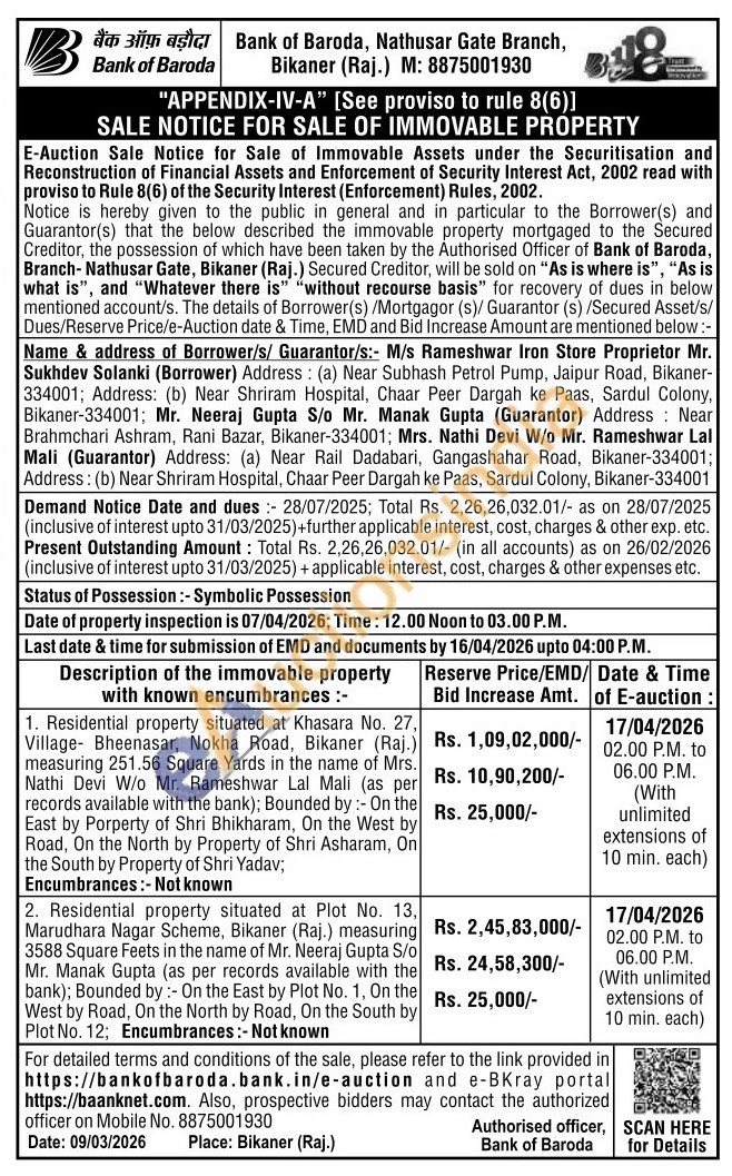 1. Residential property situated at Khasara No. 27, Village- Bheenasar, Nokha Road, Bikaner (Raj.) measuring 251.56 Square Yards in the name of Mrs. Nathi Devi W/o Mr. Rameshwar Lal Mali (as per records available with the bank); Bounded by:- On the East by Porperty of Shri Bhikharam, On the West by Road, On the North by Property of Shri Asharam, On the South by Property of Shri Yadav; Encumbrances :- Not known
