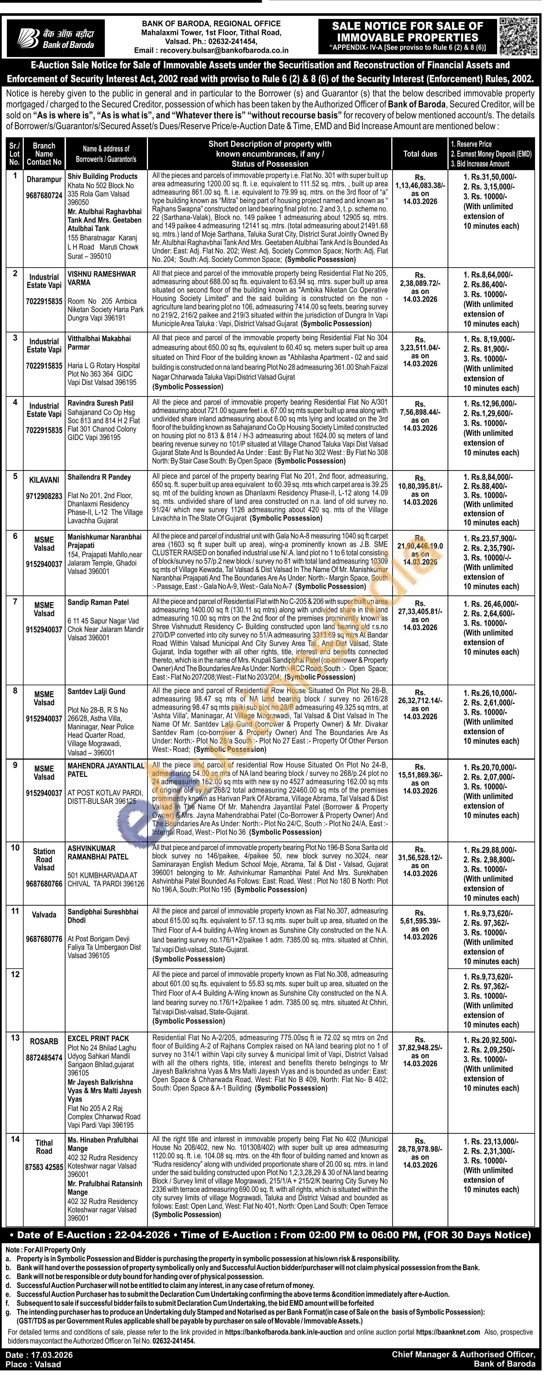 Contact no 9152940037/ 02632-241454, Email: recovery.bulsar@bankofbaroda.co.in