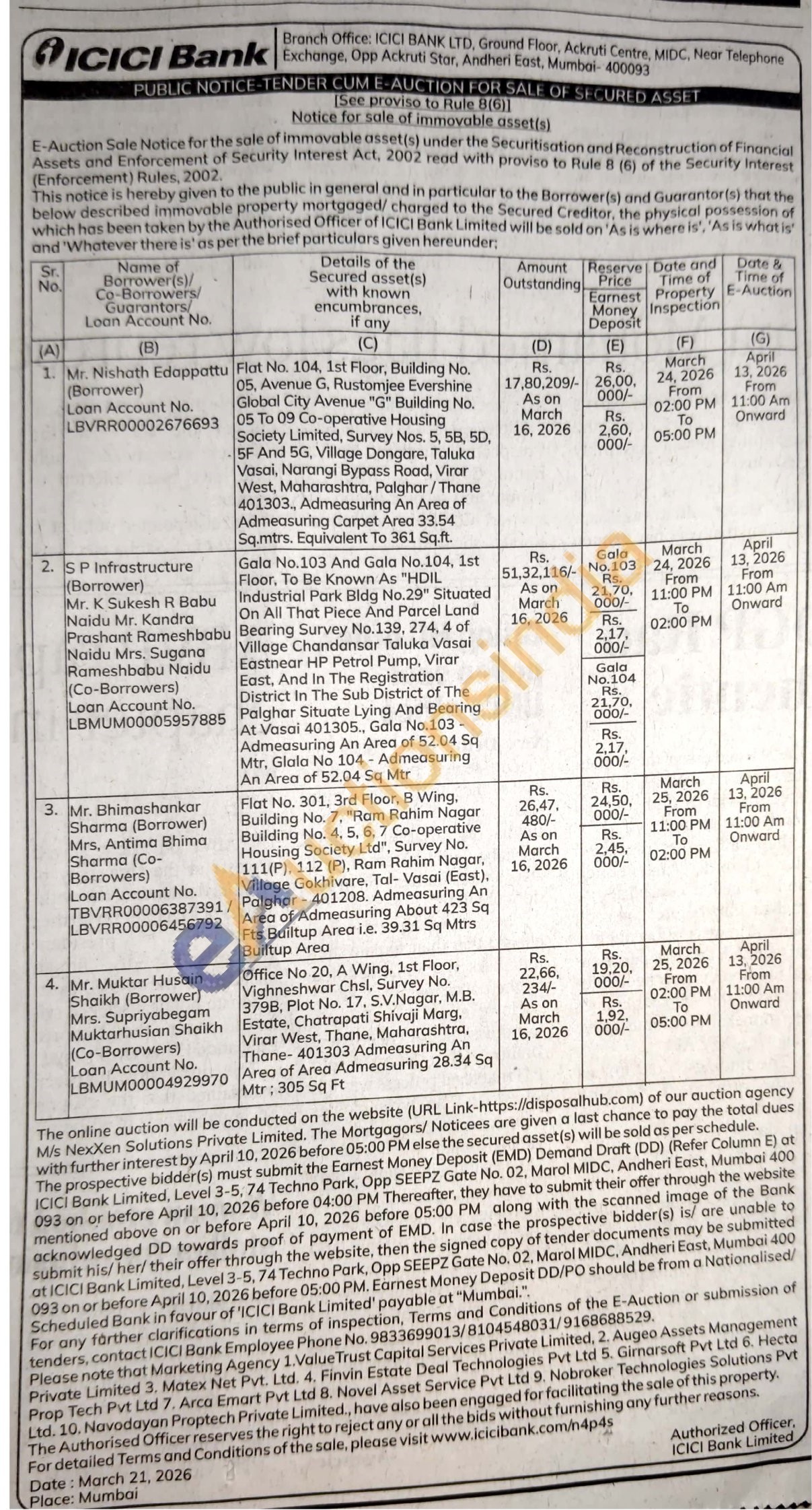 1 .Flat No. 104, 1st Floor, Building No. 05. Avenue G. Rustomjee Evershine Global City Avenue "G" Building No. 05 To 09 Co-operative Housing Society Limited, Survey Nos. 5, 58, 5D, 5F And 5G, Village Dongare, Taluka Vasai. Norangi Bypass Road, Virar West, Maharashtra, Palghar/Thane 401303, Admeasuring An Area of Admeasuring Corpet Area 33.54 Sq.mtrs. Equivalent To 361 Sq.ft.