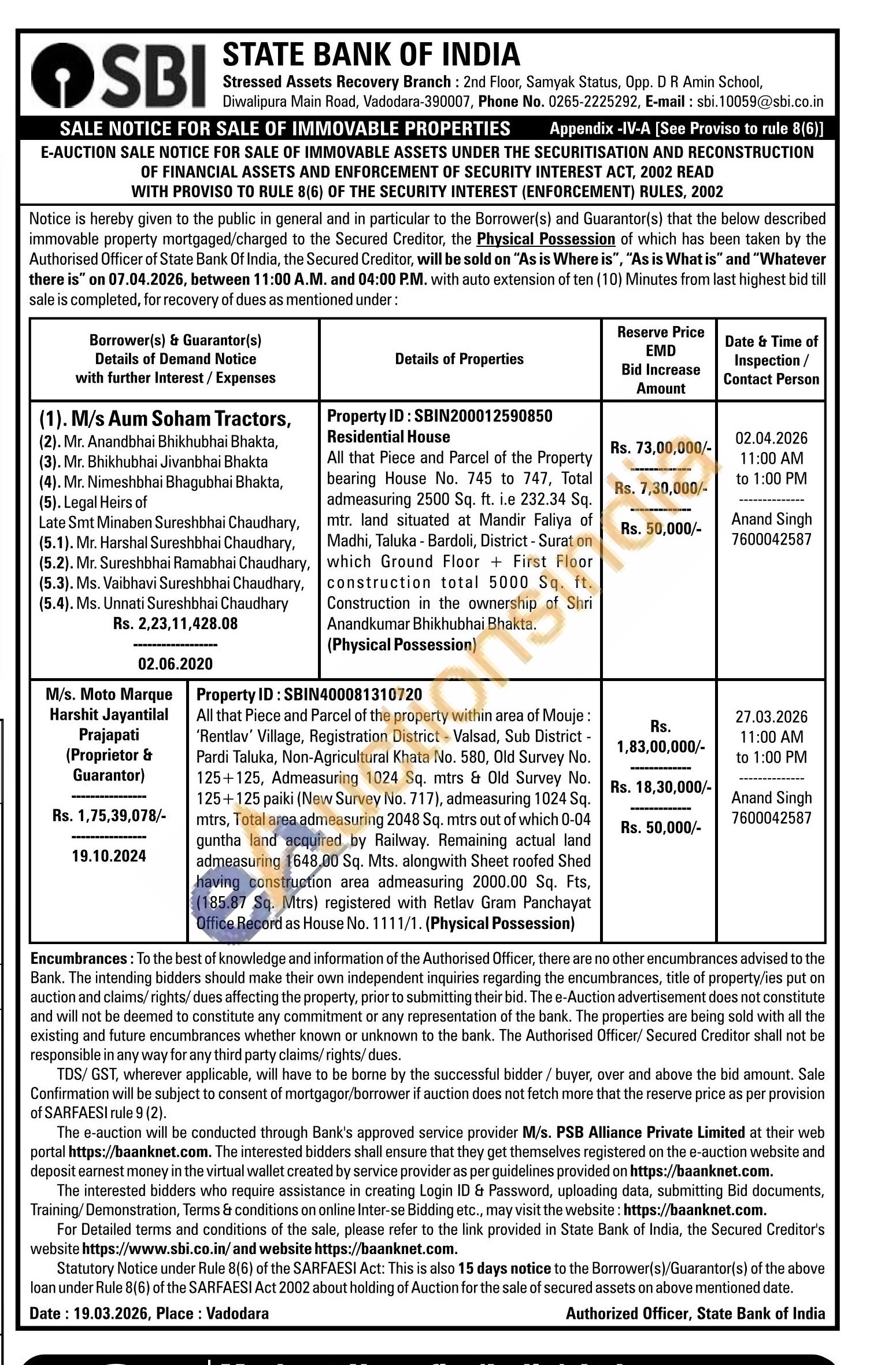 All that Piece and Parcel of the Property bearing House No. 745 to 747, Total admeasuring 2500 Sq. ft. i.e 232.34 Sq. mtr. land situated at Mandir Faliya of Madhi, Taluka - Bardoli, District - Surat on which Ground Floor First Floor construction total 5000 Sq. ft. Construction in the ownership of Shri Anandkumar Bhikhubhai Bhakta.
