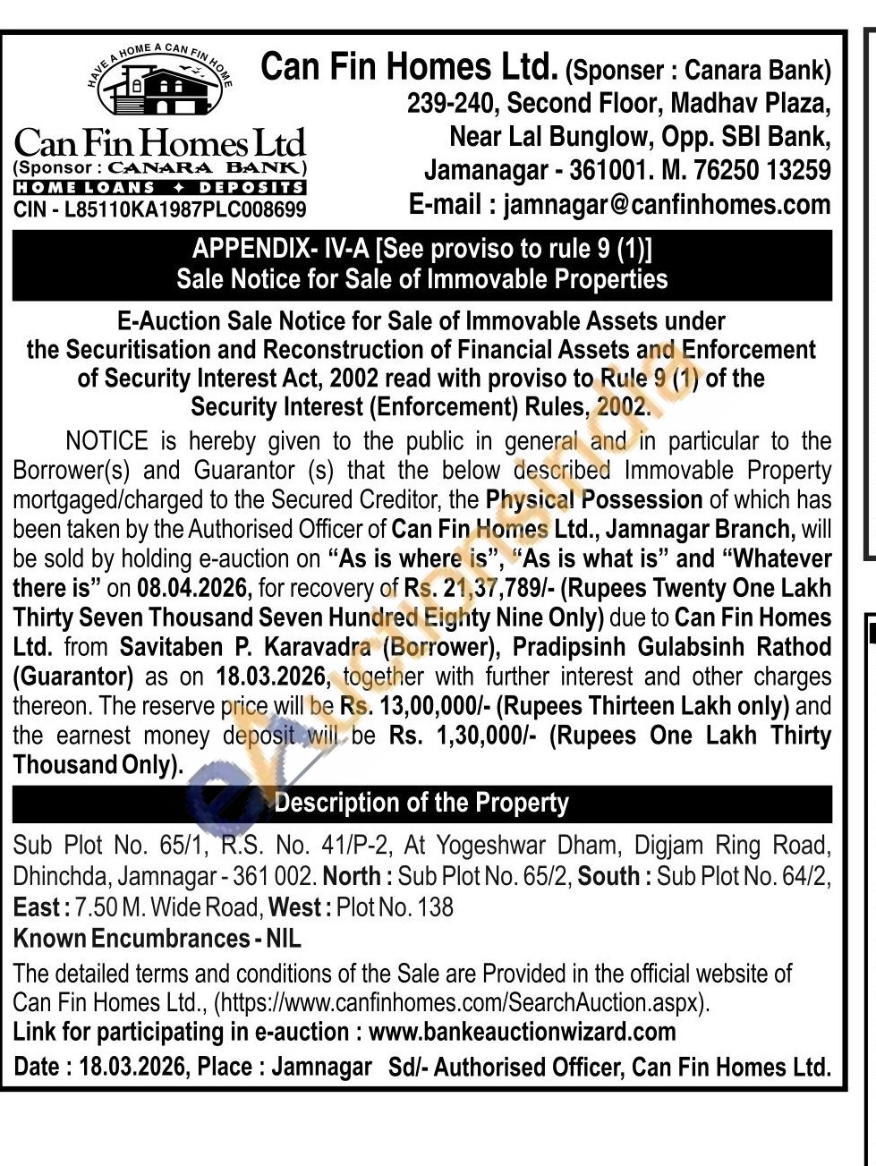 Sub Plot No. 65/1, R.S. No. 41/P-2, At Yogeshwar Dham, Digjam Ring Road, Dhinchda, Jamnagar - 361 002. North: Sub Plot No. 65/2, South: Sub Plot No. 64/2, East: 7.50 M. Wide Road, West: Plot No. 138