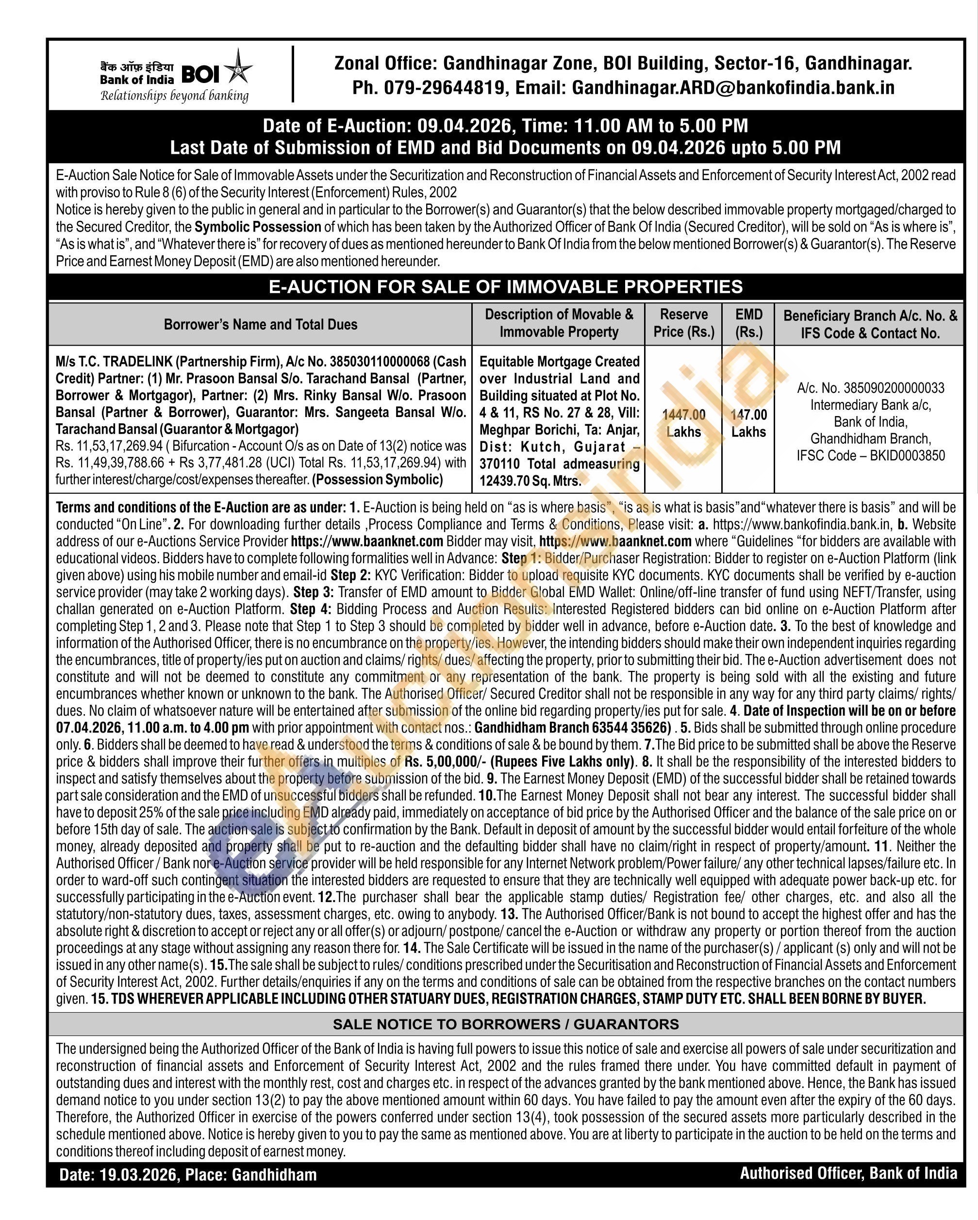 Equitable Mortgage Created over Industrial Land and Building situated at Plot No. 4 & 11, RS No. 27 & 28, Vill: Meghpar Borichi, Ta: Anjar, Dist: Kutch, Gujarat-370110 Total admeasuring 12439.70 Sq. Mtrs