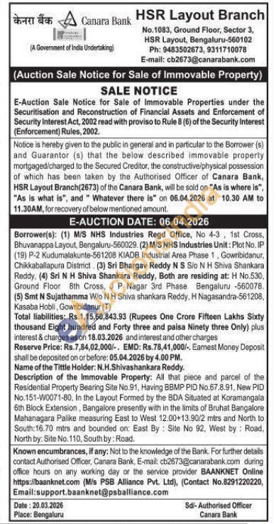 Description of the Immovable Property: All that piece and parcel of the Residential Property Bearing Site No.91, Having BBMP PID No.67.8.91, New PID No.151-W0071-80, In the Layout Formed by the BDA Situated at Koramangala 6th Block Extension, Bangalore presently with in the limits of Bruhat Bangalore Mahanagara Palike measuring East to West 12.00+13.90/2 mtrs and North to South:16.70 mtrs and bounded on: East By: Site No 92, West by Road, North by: Site No. 110, South by: Road