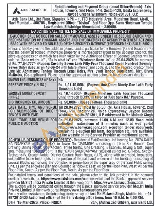 SCHEDULE-DESCRIPTION OF PROPERTY:- Residential Flat/Dwelling Unit bearing No. 2074 GAUR SAUNDARYAM on the 19 Floor in Tower No. "JASMINE" consisting of Three Bed Rooms, One Drawing Dining Room, One Kitchen, Three toilets, One Dressing, Balconies, having a total super area measuring 1650.00 Sq.ft. in the "GAUR SAUNDARYAM" situated at Plot No. GH-05C, Sector-Techzone-IV, Greater Noida, District Gautam Budh Nagar, (U.P.), along along with undivided, divided, impartibly, unidentified lease-hold rights in the portion of the said land underneath the building, consisting of several Blocks comprising the Complex, in proportion of the super area of the Said Flat/Dwelling Unit, as per the enclosed plan and Bounded as follows: East: As per the Floor Plan, West: As per the Floor Plan, South: As per the Floor Plan, North: As per the Floor Plan