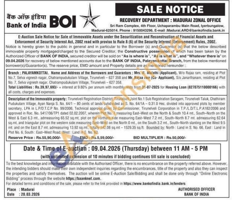 Contact no 9150043296. E-mail:Madurai.ARD@bankofindia.bank.in