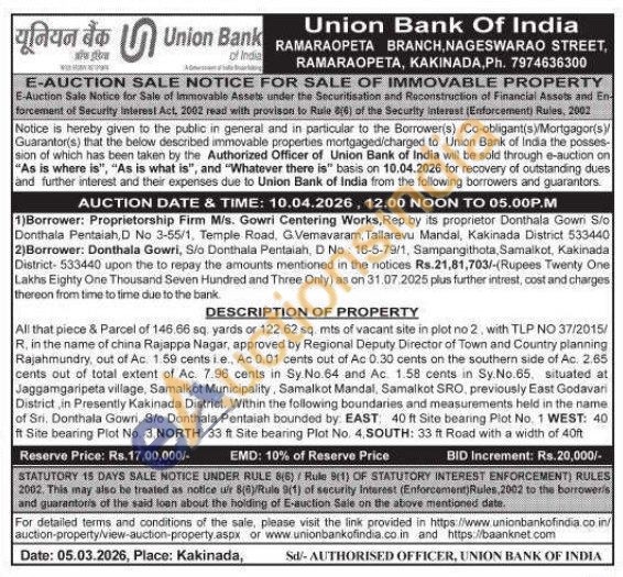 All that piece & Parcel of 146.66 sq. yards or 122.62 sq. mts of vacant site in plot no 2, with TLP NO 37/2015/R, in the name of china Rajappa Nagar, approved by Regional Deputy Director of Town and Country planning Rajahmundry, out of Ac 1.59 cents ie, Ac 0.01 cents out of Ac 0.30 cents on the southern side of Ac. 2.65 cents out of total extent of Ac. 7.96 cents in Sy No.64 and Ac. 1.58 cents in Sy.No.65, situated at Jaggamgaripeta village, Samalkot Municipality, Samalkot Mandal, Samalkot SRO, previously East Godavari District in Presently Kakinada District. Within the following boundaries and measurements held in the name of Sri, Donthala Gowri, S/o Donthala Pentaiah bounded by EAST 40 ft Site bearing Plot No. 1 WEST: 40 ft Site bearing Plot No. 3. NORTH: 33 ft Site bearing Plot No. 4, SOUTH: 33 ft Road with a width of 40ft