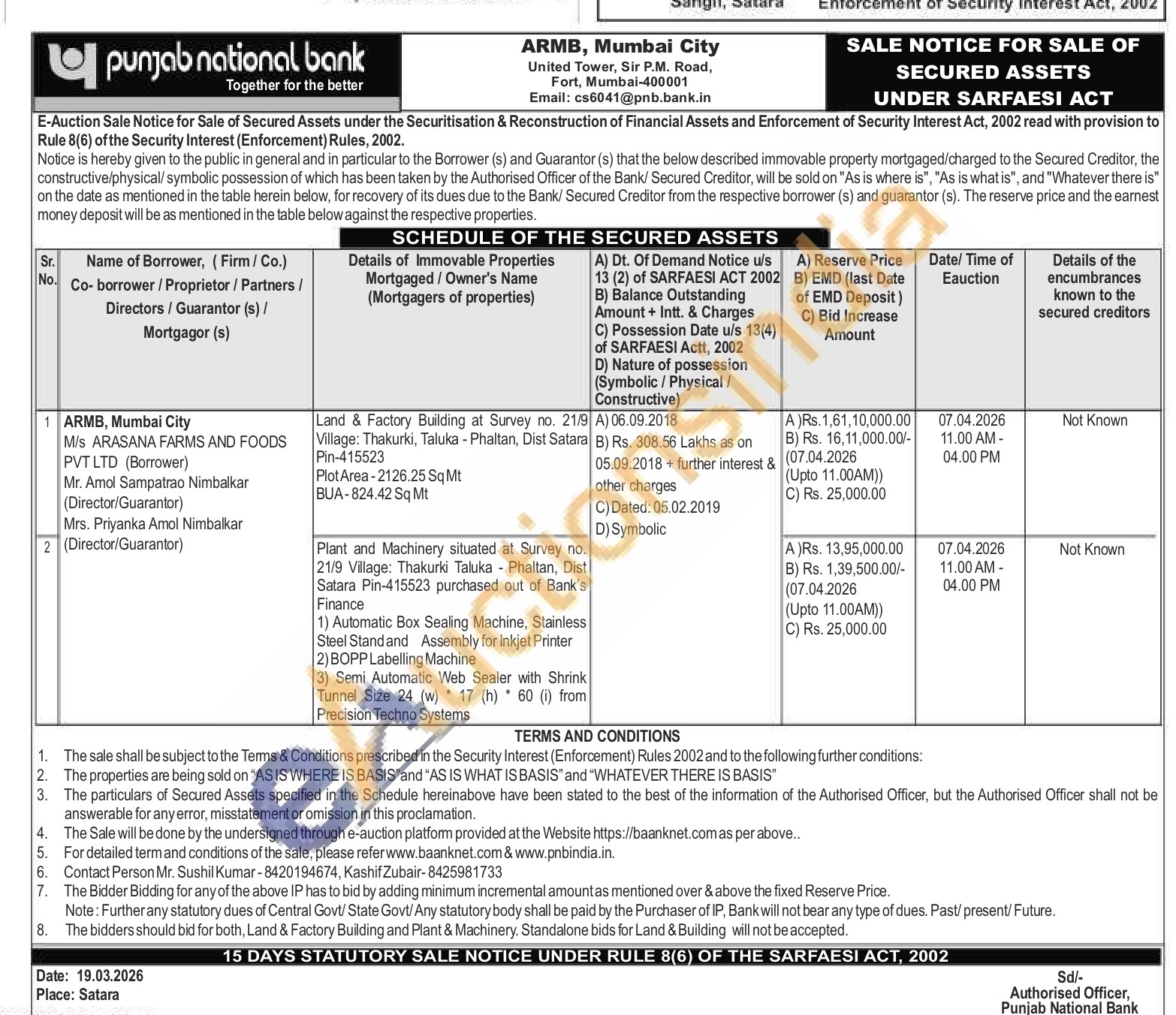Plant and Machinery situated at Survey no. 21/9 Village: Thakurki Taluka Phaltan, Dist Satara Pin-415523 purchased out of Bank's Finance