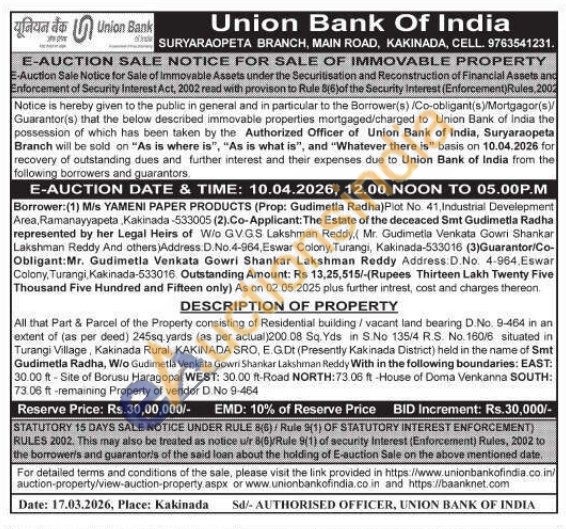 All that Part & Parcel of the Property consisting of Residential building / vacant land bearing D.No. 9-464 in an extent of (as per deed) 245sq yards (as per actual)200.08 Sq. Yds in S.No 135/4 RS. No. 160/6 situated in Turangi Village, Kakinada Rural, KAKINADA SRO, E G.Dt (Presently Kakinada District) held in the name of Smt Gudimetla Radha, W/o Gudimetla Venkata Gowri Shankar Lakshman Reddy With in the following boundaries: EAST: 30.00 ft-Site of Borusu Haragopal WEST: 30.00 ft-Road NORTH:73.06 ft-House of Doma Venkanna SOUTH: 73.06 ft-remaining Property of vendor D No 9-464