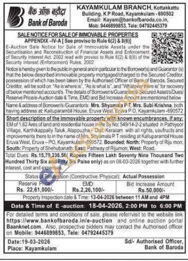 contact the Authorised officer on Mobile: 9446899853, Tele: 04792445379