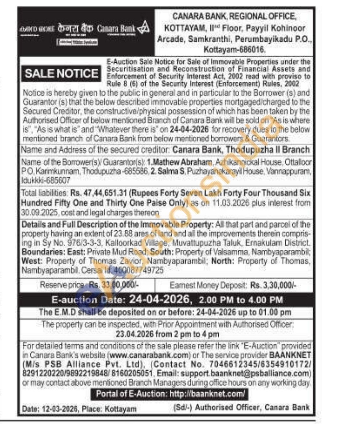 All that part and parcel of the property having an extent of 23.88 ares of land and all the improvements therein compris-ing in Sy No. 976/3-3-3, Kalloorkad Village, Muvattupuzha Taluk, Ernakulam District. Boundaries: East: Private Mud Road, South: Property of Valsamma, Nambyaparambil; West: Property of Thomas Zavior, Nambyaparambil; North: Property of Thomas, Nambyaparambil. Cersai Id: 400087749725
