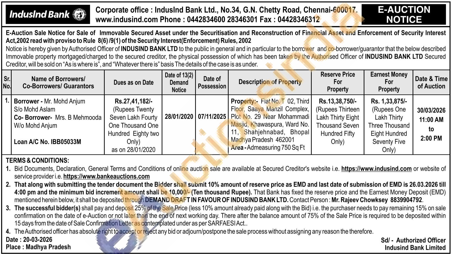 Property:- Flat No. T 02, Third Floor, Saaya Manzil Complex, Plot No. 29 Near Mohammadi Masjid, Khawaspura, Ward No. 11, Shahjehnabad, Bhopal Madhya Pradesh 462001
