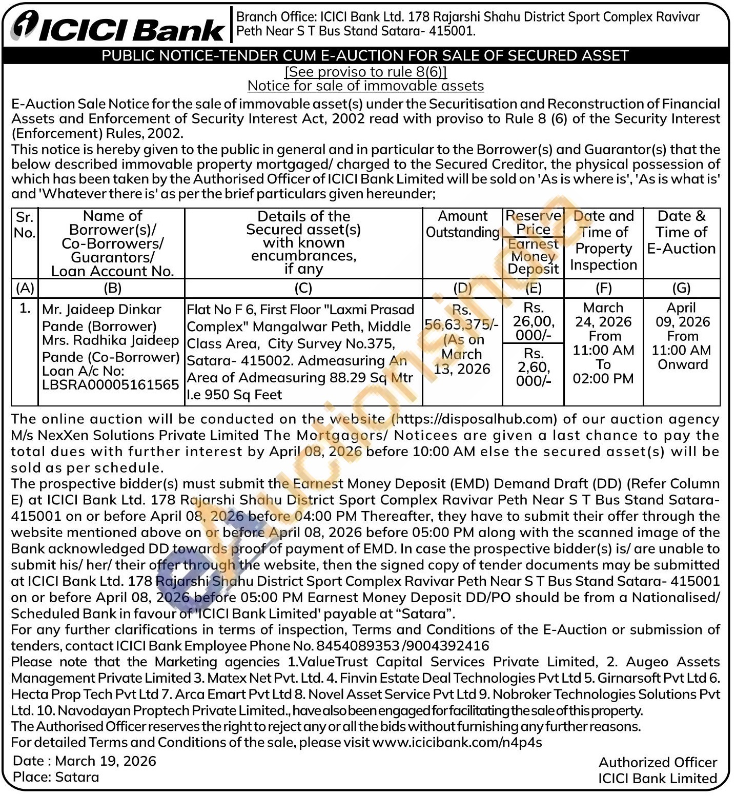 Flat No F 6, First Floor "Laxmi Prasad Complex" Mangalwar Peth, Middle Class Area, City Survey No.375, Satara- 415002. Admeasuring An Area of Admeasuring 88.29 Sq Mtr I.e 950 Sq Feet